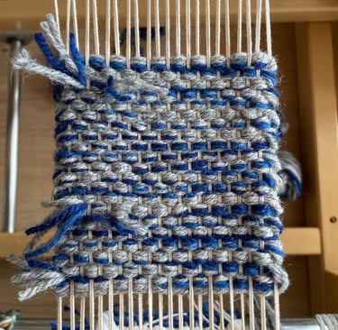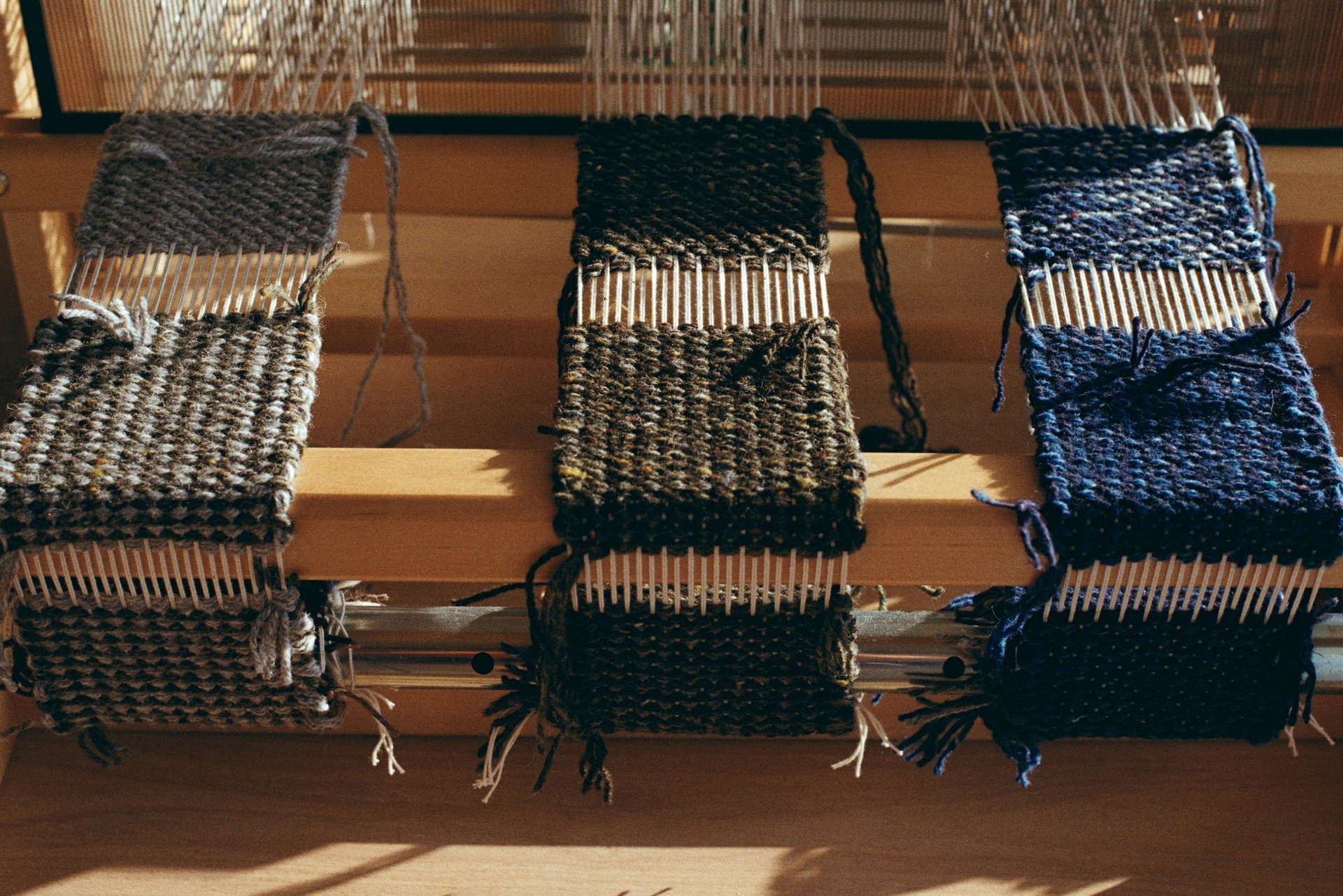 We create these works on our 8-shaft table loom, a compact version of the traditional countermarch loom. This smaller loom gives us the flexibility to experiment without committing to a full-scale production warp, allowing us to explore quickly and intuitively.