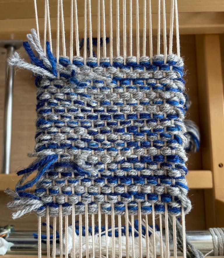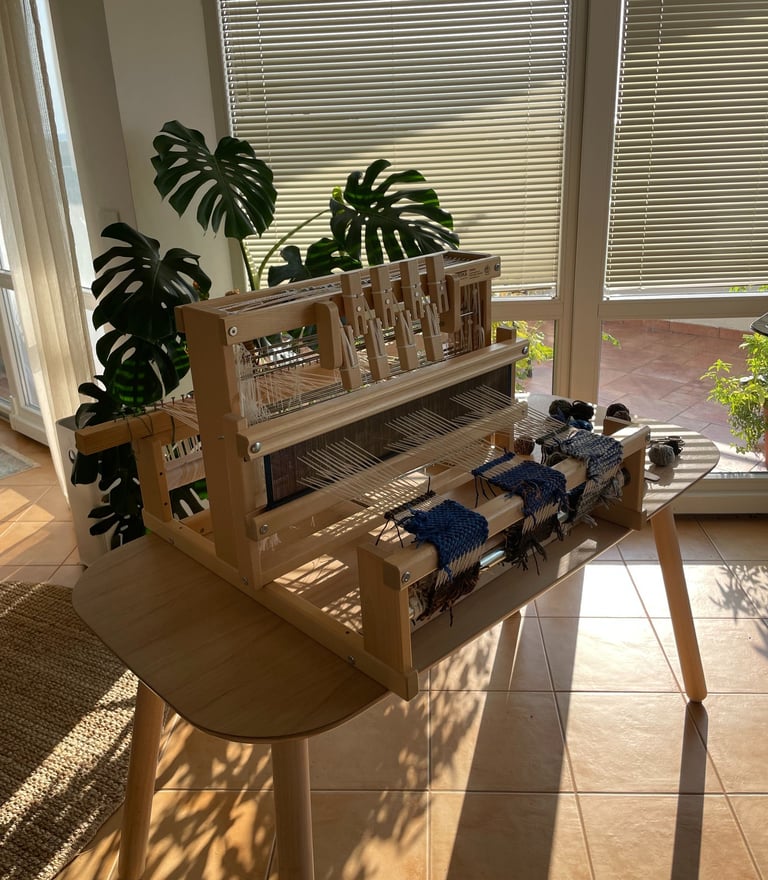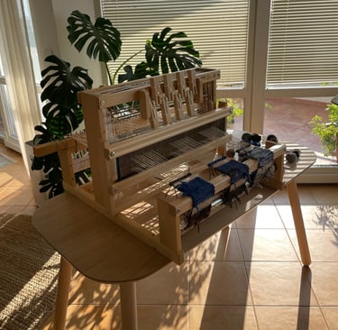 We create these works on our 8-shaft table loom, a compact version of the traditional countermarch loom. This smaller loom gives us the flexibility to experiment without committing to a full-scale production warp, allowing us to explore quickly and intuitively. Working on it feels like sketching in yarn — the perfect space to play, test, and innovate.
